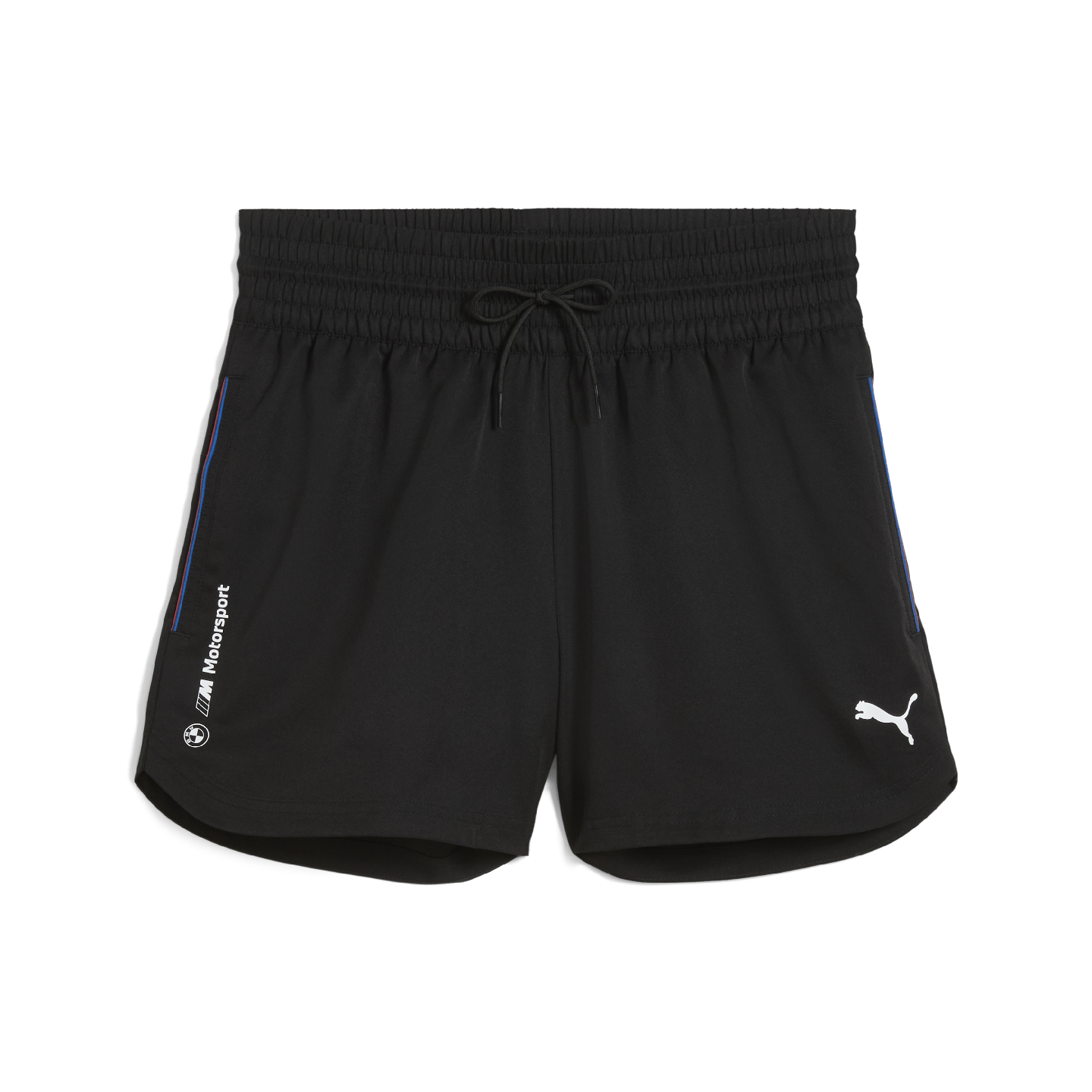The BMW MMS WMN ESS+ Woven Shorts impress with their regular fit and sporty design, with the BMW M Motorsport logo print on the left thigh and the PUMA logo print on the right thigh.